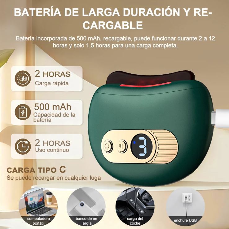 Este dispositivo 3 en 1 ofrece calor relajante, vibración intensa y terapia de luz roja, ideales para estimular la circulación sanguínea, relajar los músculos tensos y mejorar la absorción de cremas y aceites. 🌿💧 ¡Tu piel se sentirá renovada desde la primera sesión!