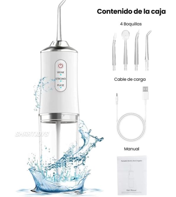 Con el Irrigador Dental Portátil™, tendrás en tu mano la solución profesional para una limpieza profunda y efectiva 💪. Su tecnología de chorro de agua a presión elimina hasta el 99% de residuos, bacterias y suciedad interdental que provocan mal aliento, caries y problemas de encías 👄✨.